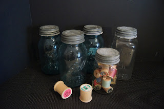 And these were my other purchases from the day, a mix of Ball (blue) and Atlas (square clear) and I think one might be Kerr too (littler one) canning jars, and one was filled with mostly wood spools which makes me think of my mom, the seamstress! Maybe next week I can raid her stash and then I’ll feel like she’s in my stamp room with me!