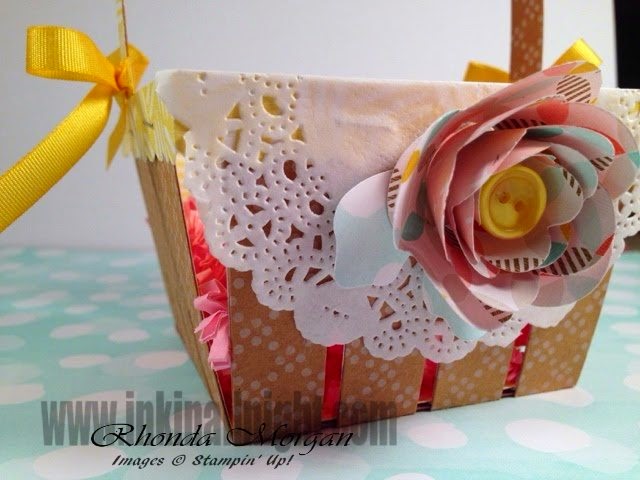 Here’s a side view so you can see how cute the little ribbon bows are on the sides where the handles are attached. This was just enough detail and left all of our attention to focus on the front, created of course with the Spiral Flower Die and a dab of hot glue. I first folded a doily in half over the edge of the basket and adhered with a dab of Green Tip glue (aka, Tombow Liquid Multipurose glue). I used one of our flower punches to add it a couple petals to act as leaves under the rose with a coordinating pattern of paper (it’s the blue bokeh, hard to see in picture). I added the smallest button to the center of the flower for a finishing touch. This flower is just 1 of the spiral die pieces, stay tuned later in the week to see what a double looks like! 😉