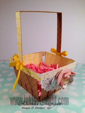 I used the Under The Tree Specialty Box designer series paper with the Kraft printed side facing out. I absolutely LOVE this paper, it’s such a great sturdy weight for 3D projects! I sure wish we would have had a spring package but luckily this pack is still available in the Clearance Rack while supplies last, $5! I selected one of the yellow print sides from the Best Year Ever Sale-a-Bration dsp pack for the basket, which meant it was a perfect match to add in the coordinating ribbon and button from the Best Year Ever SAB Accessory pack! Thank You Stampin’ Up! for doing all of the work for us and making it so easy on our end to create fabulous projects!