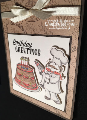 While I was making my samples I really tried to focus and create a display that showcased all of the pieces of the stamp set as well as all of the different sides of the dsp. In honesty, this paper was a bit of a struggle in the beginning but everyone except for me loves chocolate cake, so I figured chocolate cake would tie into the browns of the back ground. The cake and baker guy were cut out with the framelits, super easy. I water colored with the pencils and aqua painter. And it is so hard to get it to show up, but yes there is Wink of Stella all over that yummy icing!!