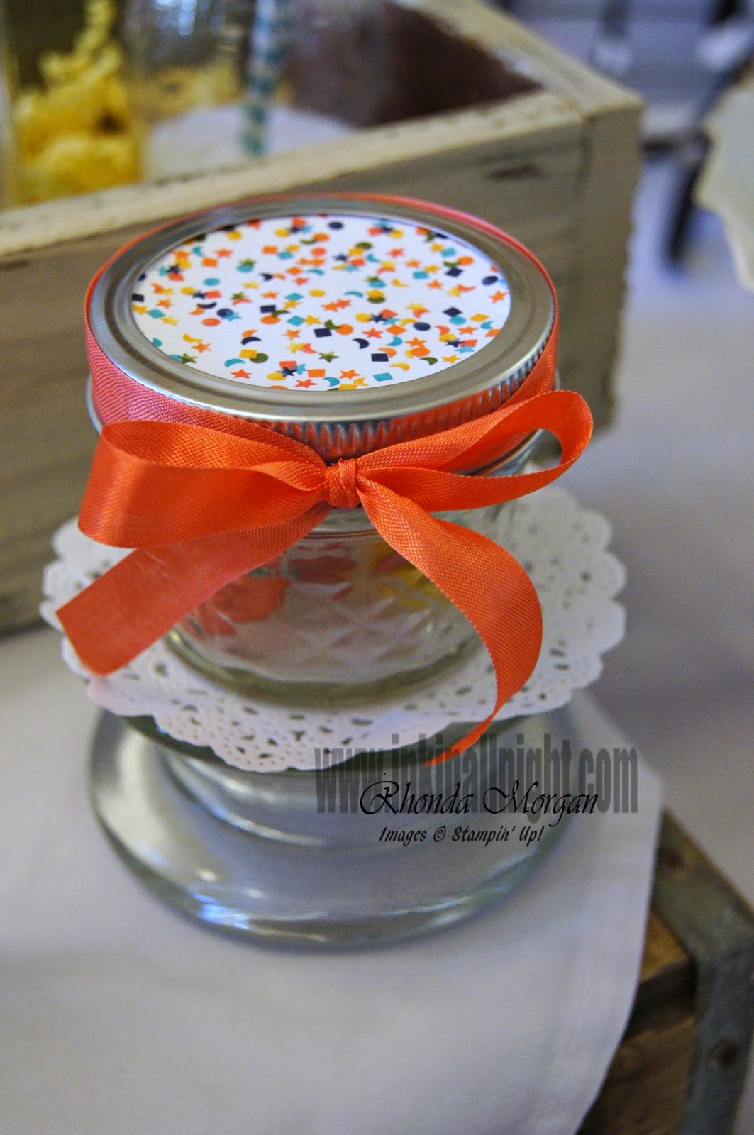 And I love mason jars or Ball jars of pretty much any size and shape!  This cute lil’ guy is the 4oz jelly jar size!  Calypso Coral seam binding around the lid and the new DSP and our circle punch to cover the lid!  Filled with the new SAB buttons, but I’ve already used almost 2 packages of them, sigh, so not so filled anymore!