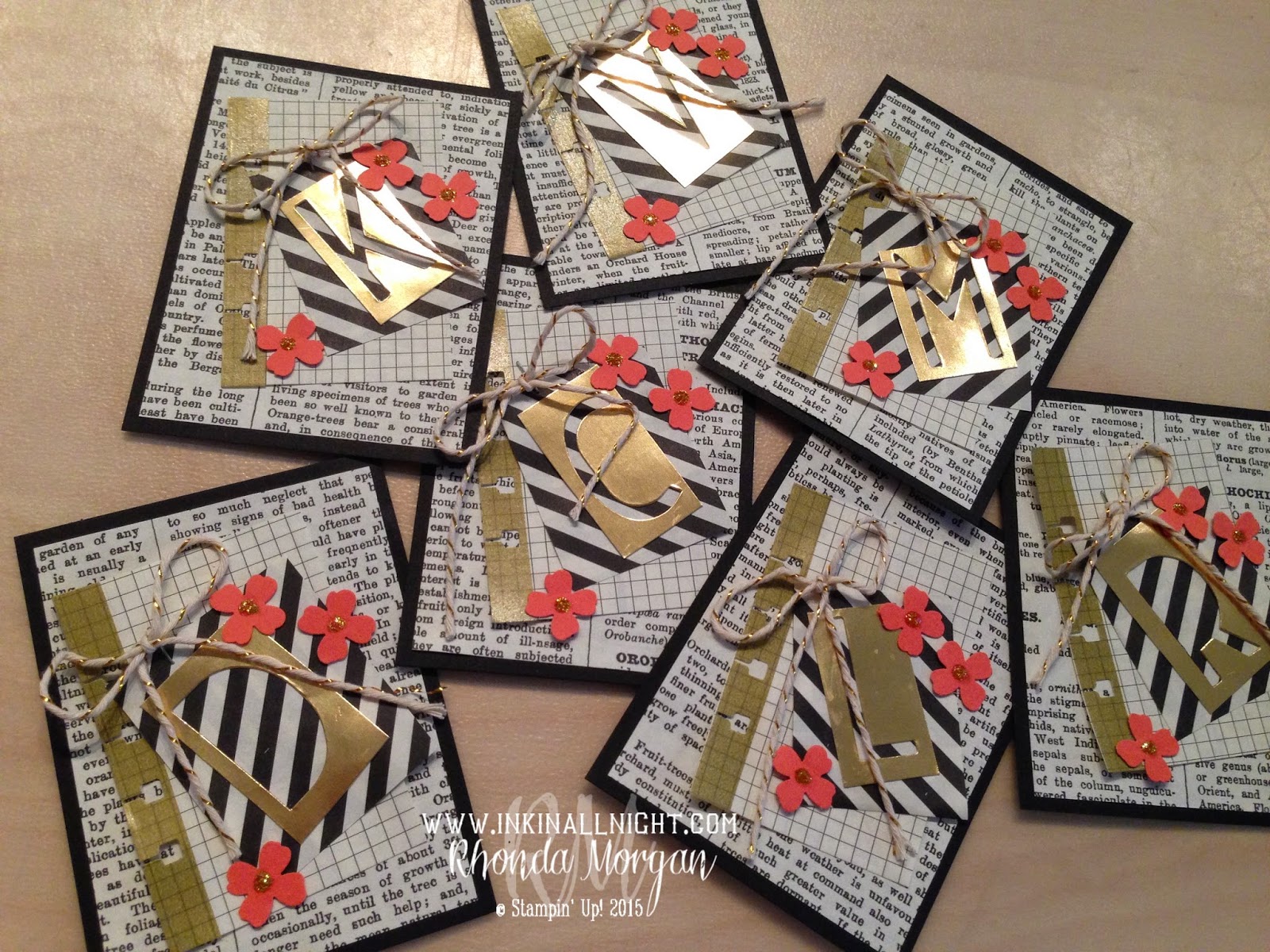 As I wrap up the pictures and shares from my INKstravagana Day, today I will share some of the make-n-takes that they made!  Last event I gave them the gift of a stamp set and for this event I decided to change things up and decided to give them the gift of GOLD!  Many things Gold!  Lots of the items that I used on their stamping projects and implemented into their treats and packaging too, that way they could duplicate later at home if they wanted and to play on their own and see what they come up with!