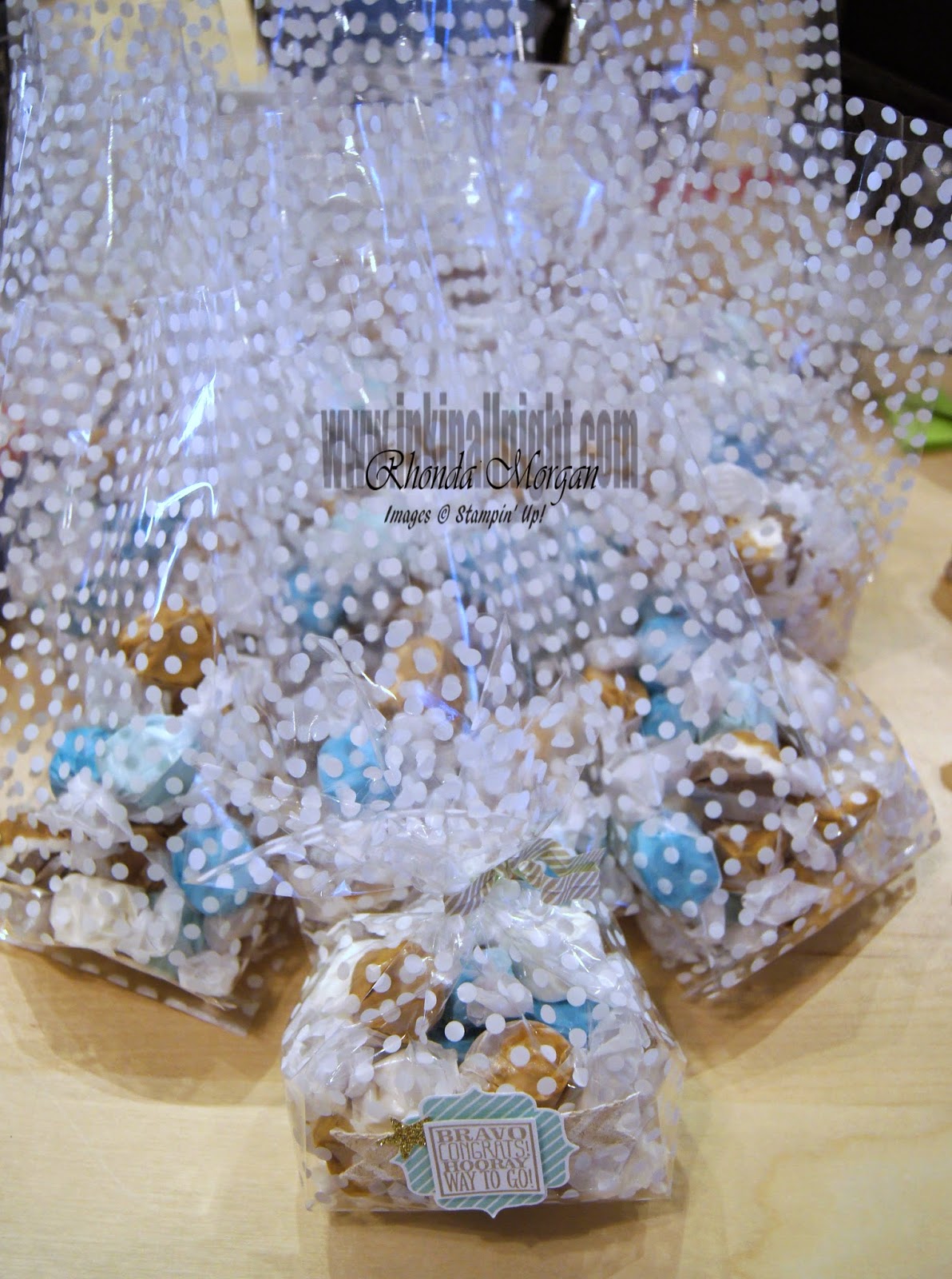 I had some of our SAB Treat Bags on stock and they were just right for this. I loved the size of the bag and that they were white polka dots (the dots went with my polka dot table runners!!) Loved them enough to use them twice even!