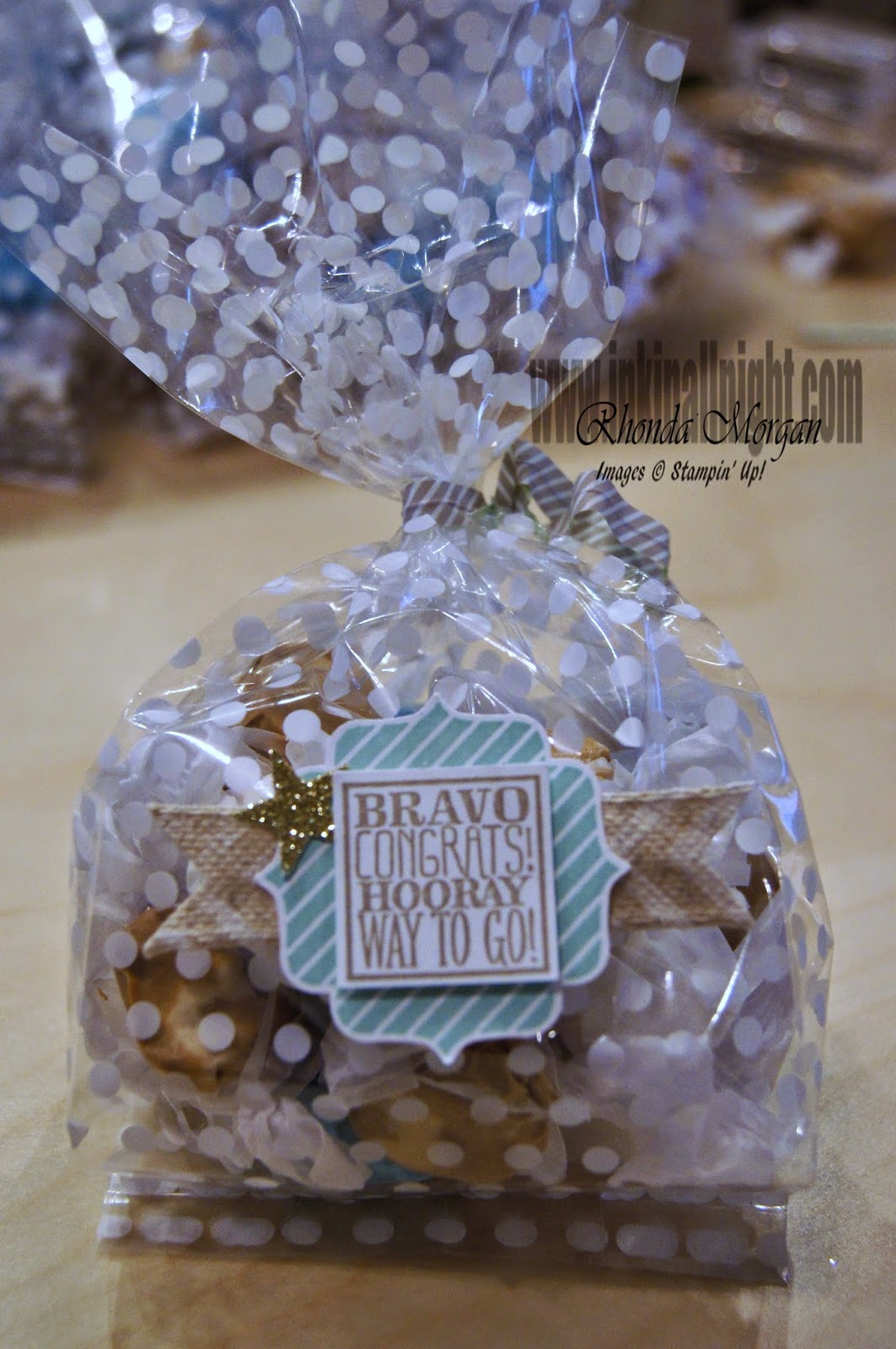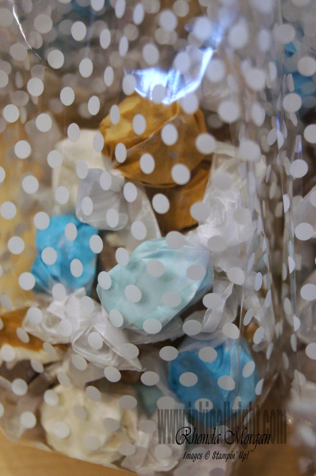Today is kind of a quickie to make compared to the Owl Fry Boxes from yesterday, but here it goes! It is actually the first treat item I made! I knew I wanted to use taffy because it’s one of my favorite treats. Growing up in Michigan and visiting Mackinaw Island, everyone knows it’s all about the fudge … except not for this non-chocolate-loving little girl, I would always get the small little bag of taffy! It’s Salt Water Taffy in one of our cute little SAB (Sale-a-Bration) treat bags! And we have a cute little Candy Store in Chandler where you can go and pick pieces of certain things by flavor or color – PERFECT and of course you can see for yourself my color choices! 😉