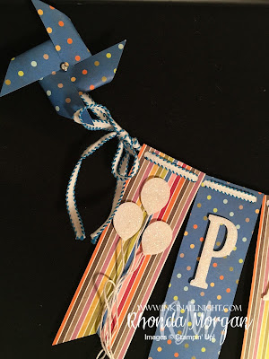 I used the polka dots and stripes sides of the designer series paper (dsp) and just alternated by 2″ x 6″ strips. I created the flag tails with the Triple Banner Punch, and used the hand-held punch to punch holes in the corners of the top edge to thread the Pacific Point new ribbon through! I chose to thread it so the ribbon showed on the top of the banner strip (vs if you threaded it the other way it would have been behind the paper). I used separate pieces of the ribbon to tie on bows at each end.