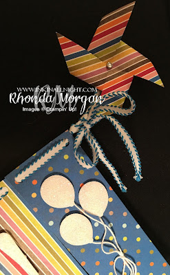 I used the Dazzling Details Glimmer Paper to cut out my PARTY! with the Large Alphabet Framelits – super easy if you peel off the light backing layer behind the glimmer paper. It’s almost as thin as a small layer of film, it just sort of peels off. Then I punched some balloons as I was only sent a small sampling of the Honeycomb Crepe Balloon shapes to work with. You could easily order those and include them as part of the class fee and then your balloons could be 1 of each color on each end and be puffy and add another layer of texture and fabulousness!!