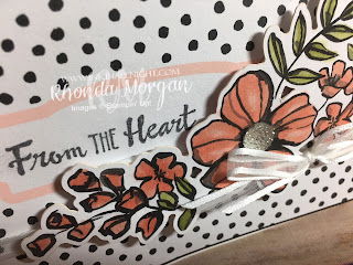 All of the cards use coordinating card stock for the card bases and layering panels. The focal layer and images are primarily from the Memories & More Petal Passions card pack, colored in with the Coral and Olive Stampin’ Blends markers and finished off with the Clear Faceted Gems!