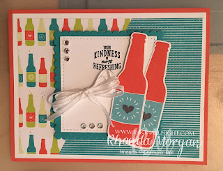 Today is a TWO-FER day!  Both of these cards feature the DSP cut on an angle!   So you take 1 sheet of each pattern (checking for direction) and cut it to size, for this dsp panel layer, I think I did 3.75″x5″ which is then mounted to a white panel layer of 4″x5.25″.  So for me, 1 sheet of dsp is the bottle caps and I wanted the direction to allow the inside images to be facing so the hearts in the red centers were upright.  And for the other pattern, I wanted the rows of bottles to be going horizontal across the wide way.  Cut the DSP at an angle, and flip the other side over to reveal the other pattern.  Adhere to the white cardstock panel layer and embellish!  It’s a fun little twist when playing with DSP!